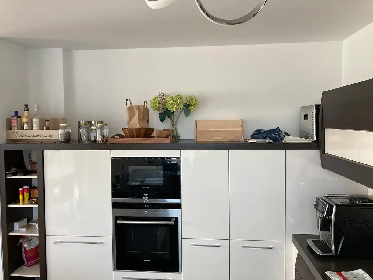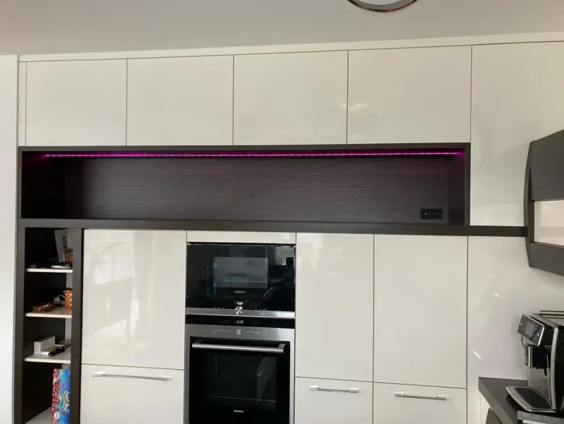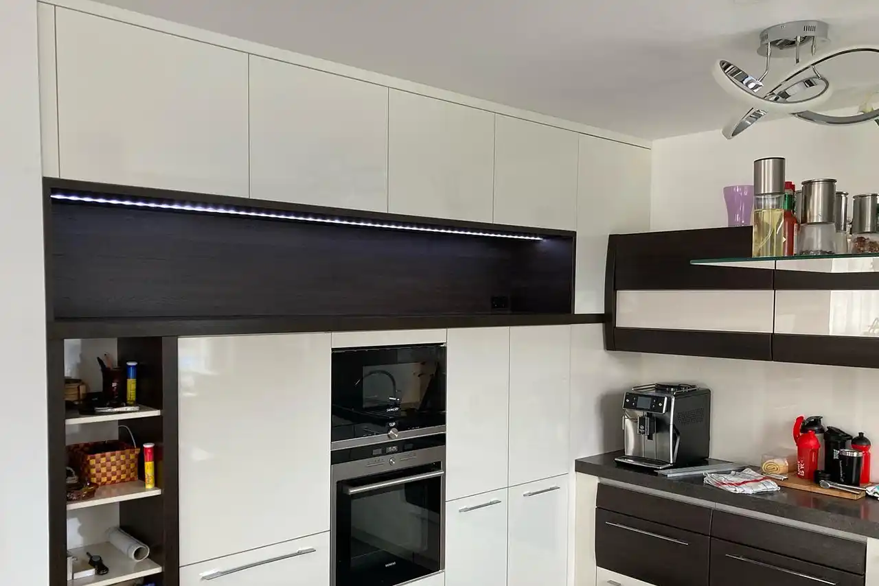 Hier durfte ich eine Küche erweitern, eine beleuchtete Nische sowie Hängeschränke schaffen zusätzlichen Stauraum.