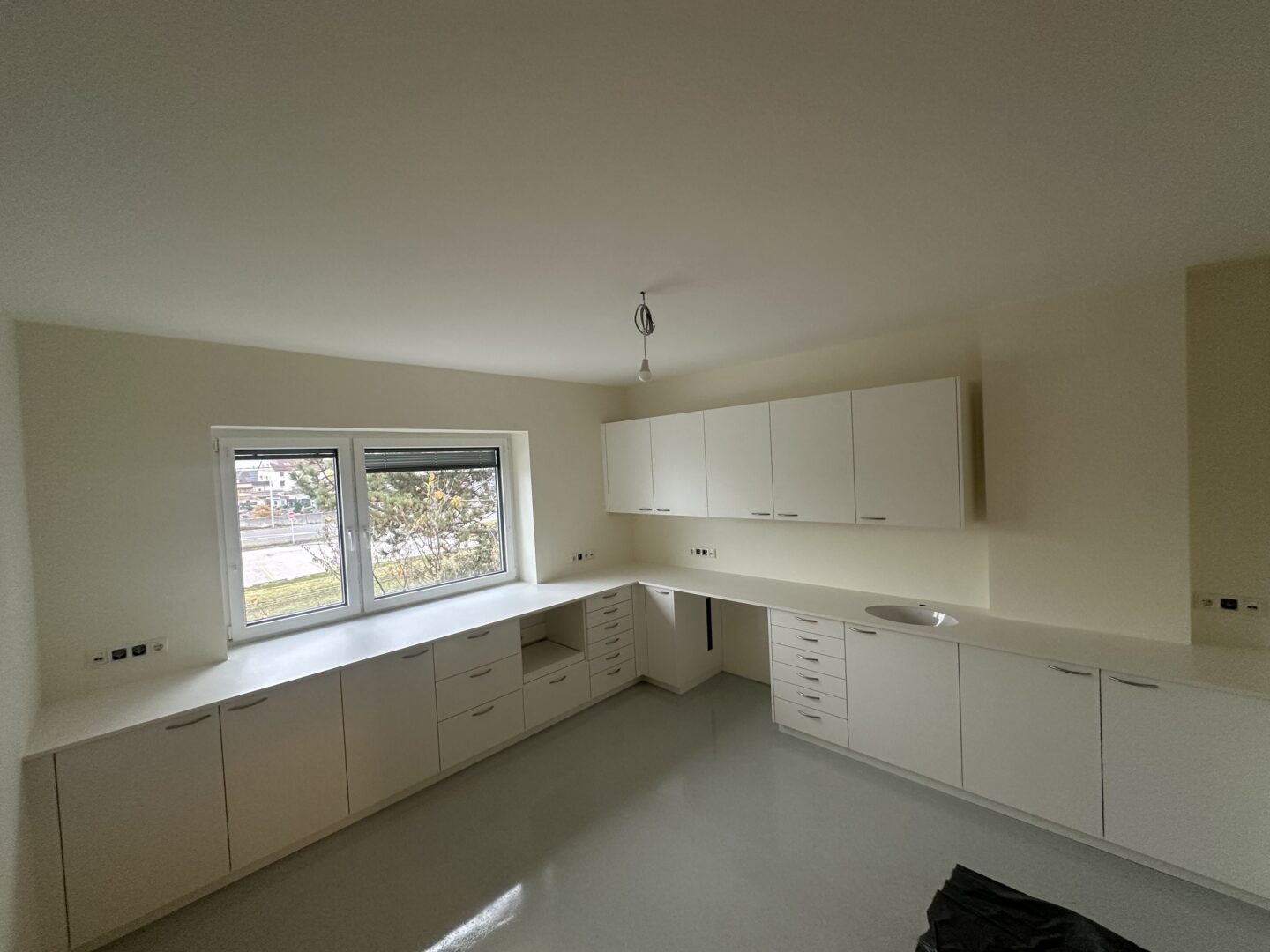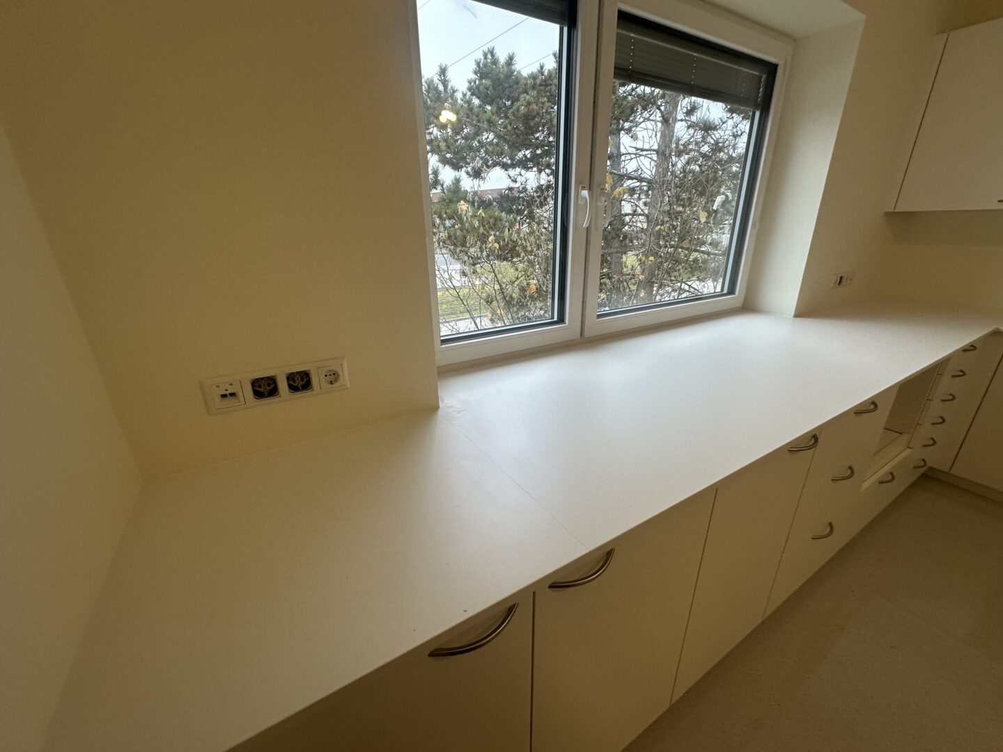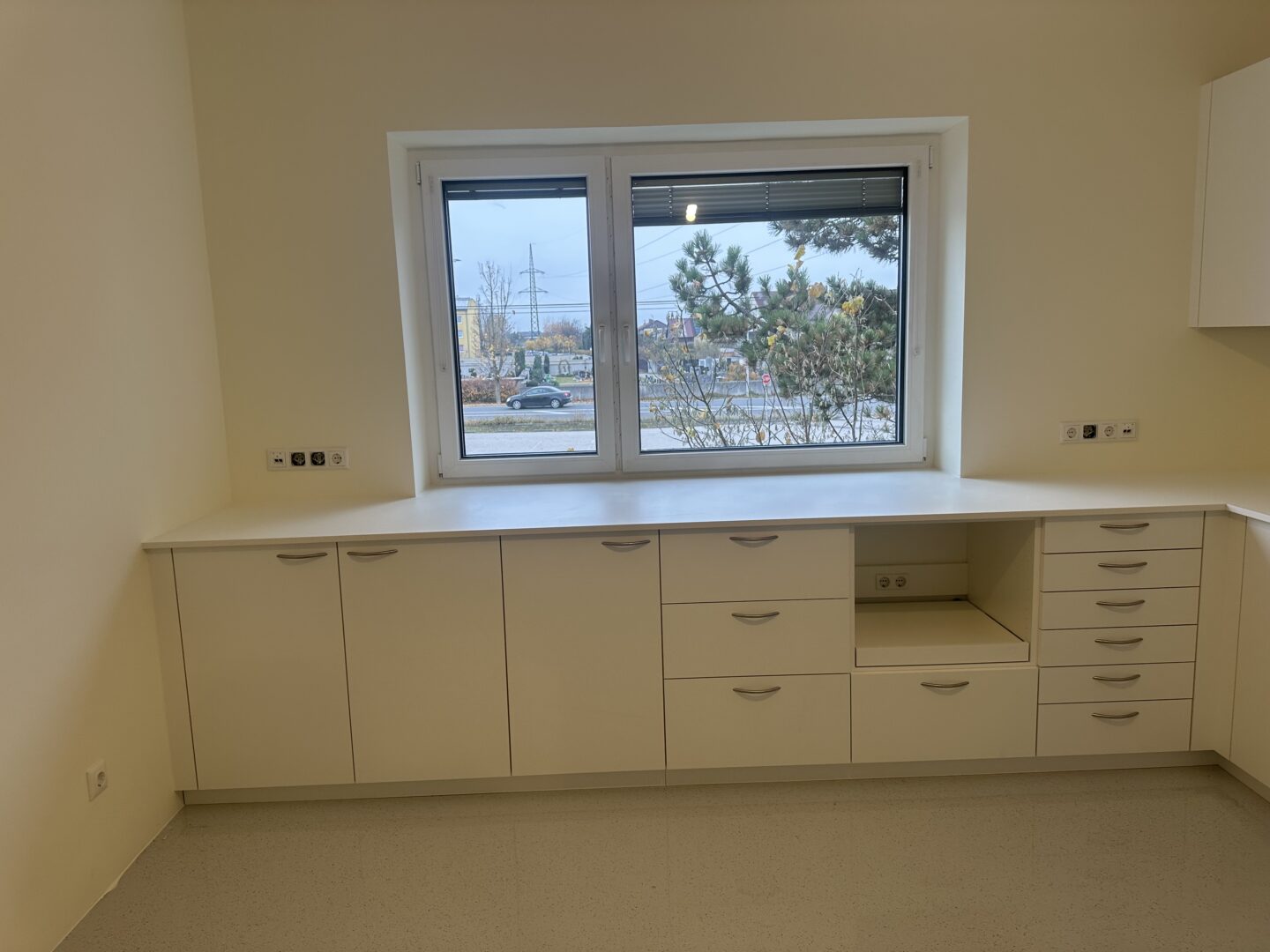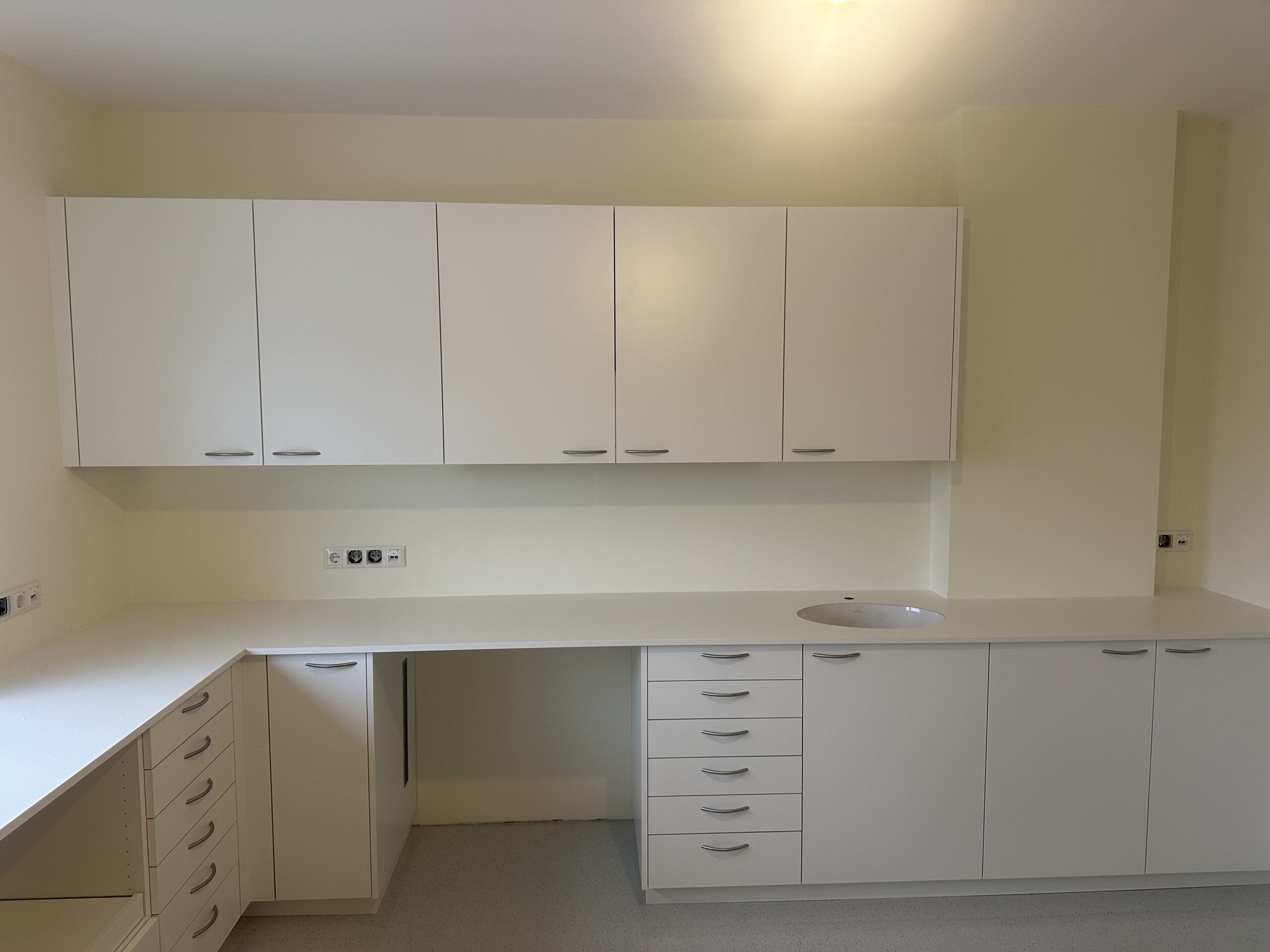-Maßgefertigte Praxismöbel für den täglichen Einsatz. Das integrierte Becken ist Teil der Arbeitsfläche – praktisch gelöst und sauber umgesetzt. Die Möblierung wurde exakt auf die Abläufe in der Praxis abgestimmt und für den langfristigen Einsatz gefertigt.